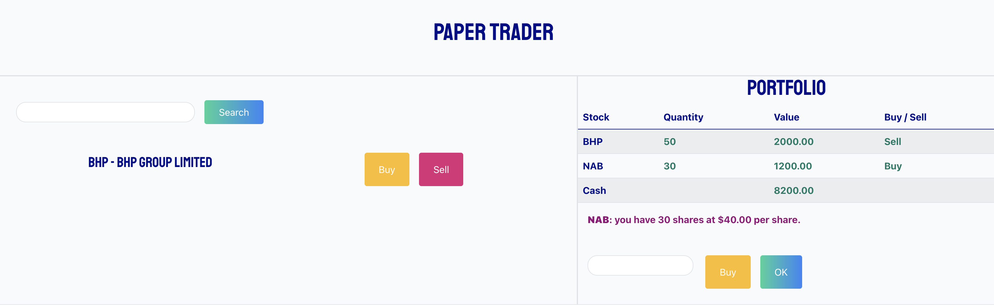 In this project, I used React, a stock API, Node.js and MySQL to create a stock application. In this application users can search for the company they wish to buy and sell stocks from. Users then can add it to their "wallet" to see all their purchases, what the cost of the stock is and the quantity in which they bought the stock.