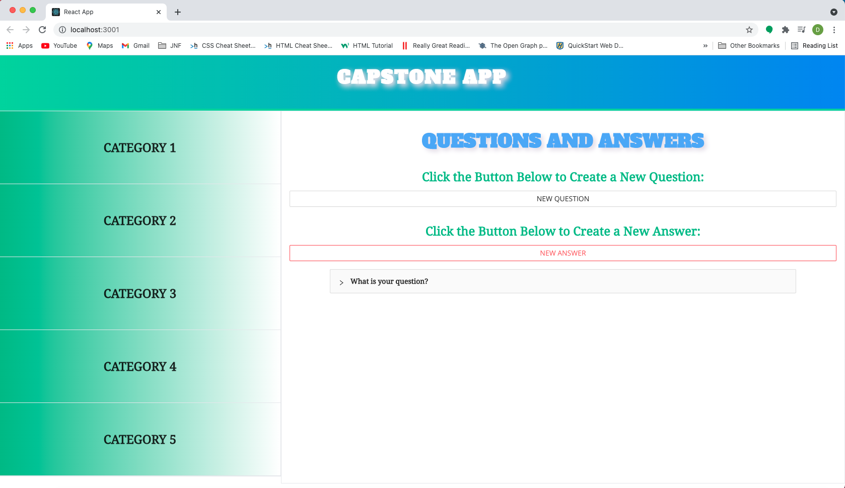 In this project, I used React, Node.js and MySQL to create a Questionaire application. In this application users can add a question to a particular category, and add an answer to the question in that particular category. Users should be able to add ask many questions and answers as they wish.